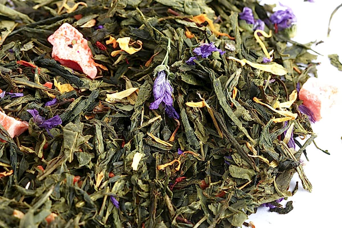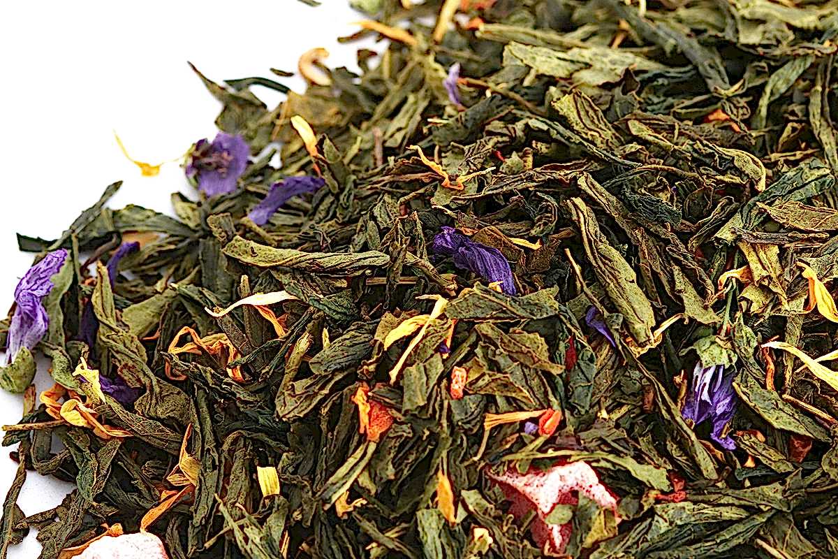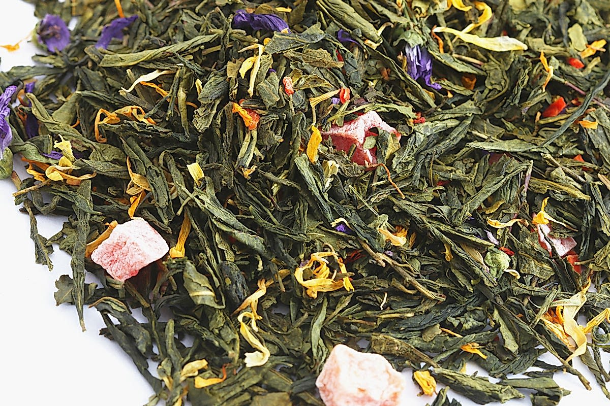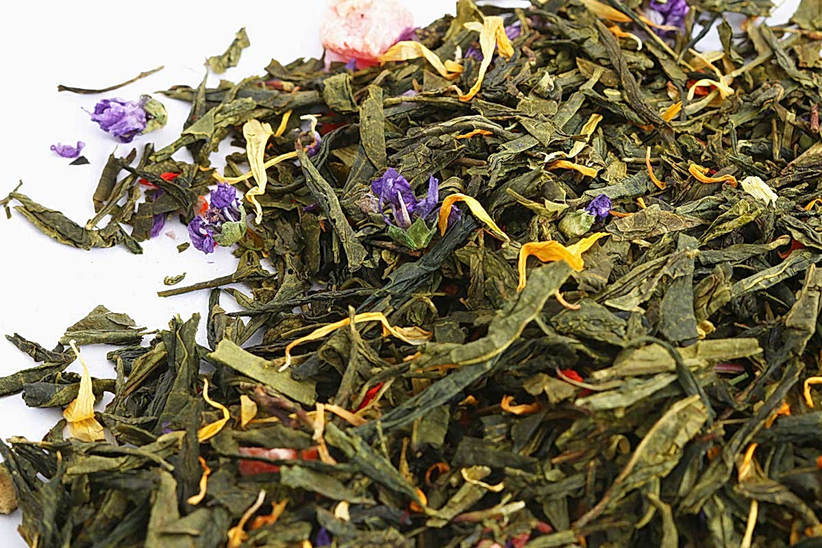 Состав: смесь зеленого китайского чая: Сенча, Лун Цзин, Pin-Up чая Бай Му Дань, цветы мальвы, кусочки ванили и папайи, лепестки сафлора, подсолнечника, пиона и апельсинового дерева, кисочки сладкой моркови.