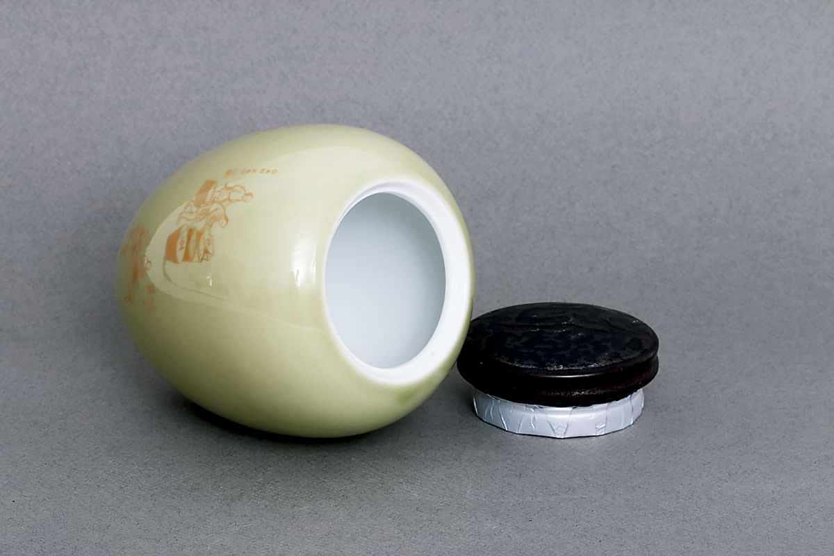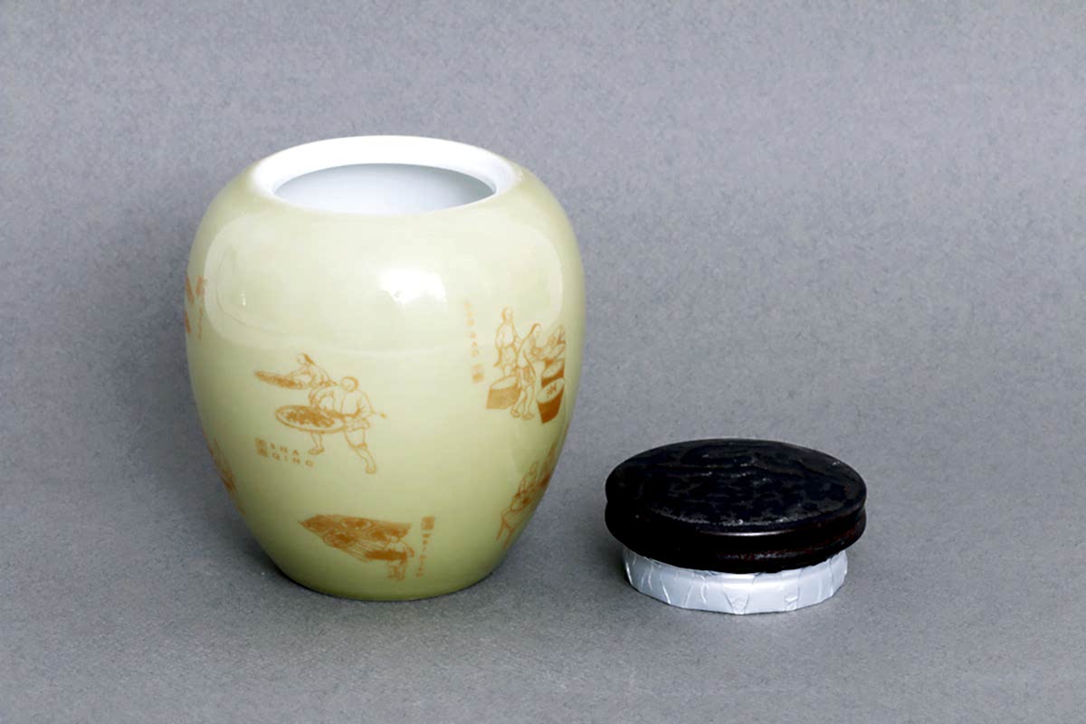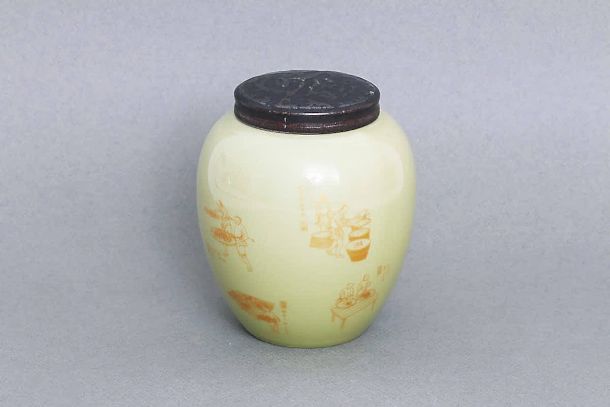 Чайница или Чаегуань (кит. 茶叶罐, "баночка для чая") - сосуд для хранения чая. Украшена изображениями с традиционными этапами изготовления зелёного чая - от Pin-Up до сортировки.
